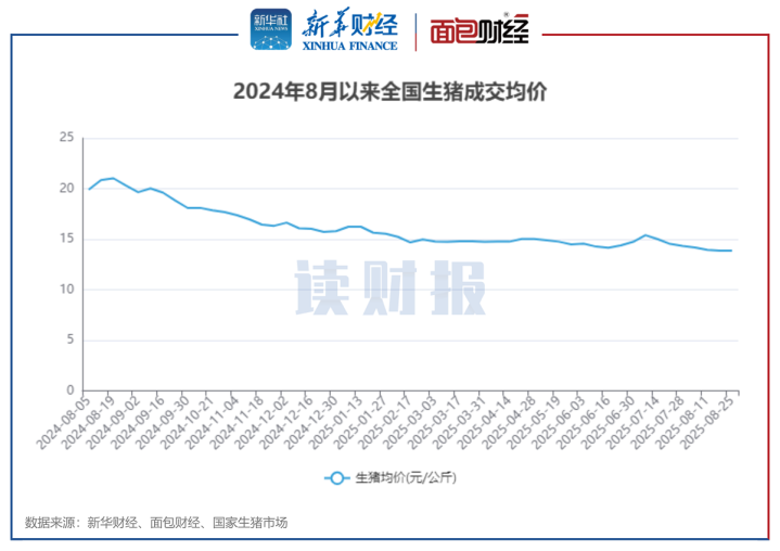 根据国家生猪市场披露的数据,全国生猪成交均价进入2025年以来相对稳定,在15元/公斤上下浮动。2025年8月,生猪成交均价出现下探至14元/公斤以下,较去年同期降幅较大。